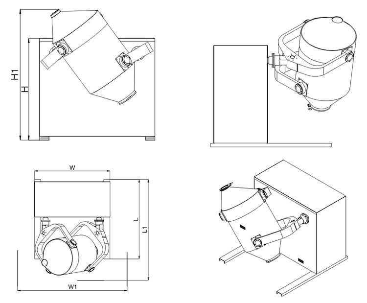 該機(jī)工作時(shí),混科器具有三維空間運(yùn)動(dòng),在進(jìn)行自轉(zhuǎn)的同時(shí)進(jìn)行公轉(zhuǎn),混料器一方面具有強(qiáng)烈的湍動(dòng)作用,加速了物料的流動(dòng)和擴(kuò)散,另一方 面有翻轉(zhuǎn)和平移運(yùn)動(dòng),克服了離心力的影響,使物料不會(huì)產(chǎn)生比重偏析和集聚現(xiàn)象,也無死角,保證混合均勻。