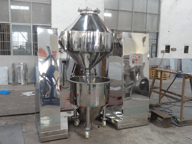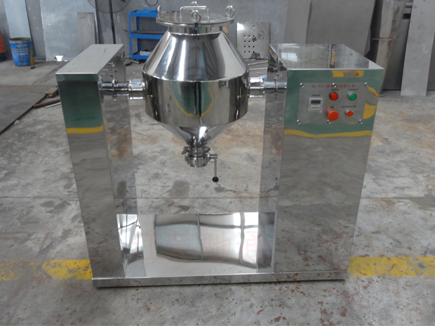 W型雙錐混合機(jī)由雙錐筒、機(jī)械密封、機(jī)架、減速傳動(dòng)、攪拌葉片等構(gòu)成。該機(jī)的工作過程是:把需混合的幾種物料通過真空輸送或人工加料投放到雙錐體內(nèi),上好筒蓋,開起設(shè)備,雙錐筒及攪拌葉片同時(shí)轉(zhuǎn)動(dòng),旋轉(zhuǎn)的雙錐筒使筒體內(nèi)物料產(chǎn)生紊亂翻滾混合,高速旋轉(zhuǎn)的攪拌葉片打碎結(jié)團(tuán)物料,使物料在筒體內(nèi)快速混合。W型雙錐混料機(jī)工作過程無死角,無沉積,可使混合的物料快速達(dá)到均勻一致的效果。